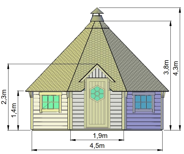 Välismõõdud: 3,26 × 3,76 m; kõrgus 3,1 m (ilma korstnata)