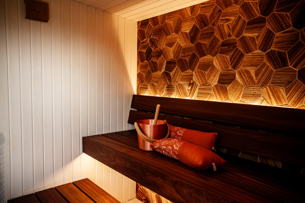 Saunalavade jaoks kasutame madala soojusjuhtivusega apachit – Aafrika väärispuitu, mis on ühtaegu mugav, kauni süümustriga ja meeldiva tooniga.